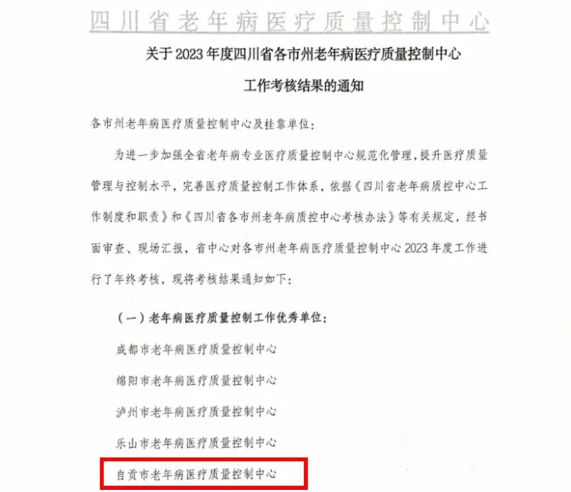 近日,2023年度四川省各市州老年病質(zhì)量控制中心工作考核結(jié)果出爐,掛靠在我院的自貢市老年病醫(yī)療質(zhì)量控制中心獲評優(yōu)秀,全省僅5家單位獲此殊榮。